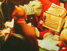 Artist Frank Perna presents a series of representational paintings of scenes from international stock exchange floors. Perna's photo referenced pop-art paintings depict crowd scenes of the frenetic activity of brightly suited teams of stock market traders. These images, culled from photojournalist sources, represent a freeze frame from the onslaught of visual commercial media. The reframed images express movement varying from glacial suspension to high velocity hustle.