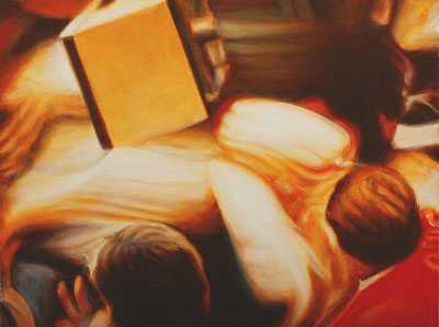 All of the paintings are approximately 12"x16", oil on wood. This group of paintings is a continuation of the Obsession series, exhibited in 2002 at Gallery 1313 and at the Joseph D. Carrier Gallery in 2003, in the sense that they both depict crowd scenes of collective ecstasy and collective insanity. The Obsession series featured random arrangements of figurative trophies painted from soft focus blurry photo-references that suggest a questioning of visual perception and materialistic chaos.